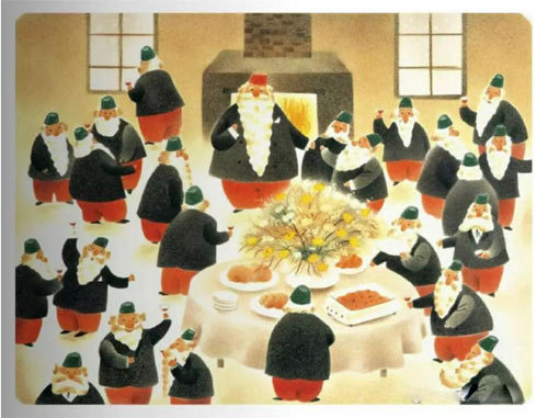 圣诞老人们全都来到了圣诞祖爷爷家,一起庆祝新年的到来。壁炉里的柴火噼噼啪啪地燃烧着,大大的桌子上摆满了美味佳肴。