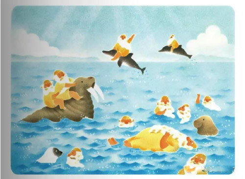 北国迎来了短暂的夏天,也迎来了一年一度的快乐暑假。圣诞老人们每天都和海豹、海象、海豚们开心地玩耍着。