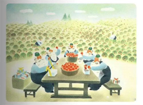 圣诞老人们把玩具一个一个丛树上摘下来,放进小盒子里。接下来,他们还要给盒子系上漂亮的丝带。