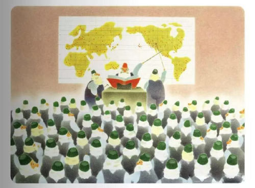 今天要举行隆重的“圣诞老人大会”。圣诞老人们聚集到了森林中的大礼堂里。“这个女孩送布娃娃。”“这个男孩送玩具汽车。