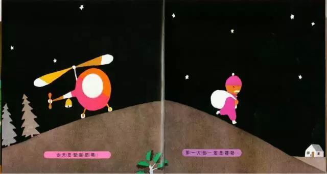 瞧,那应该是圣诞老人吧?这个圣诞老人没有坐驯鹿拉的雪橇,而是坐着飞机来给小朋友送礼物的呦!独特的开篇,就吸引了孩子们的注意。