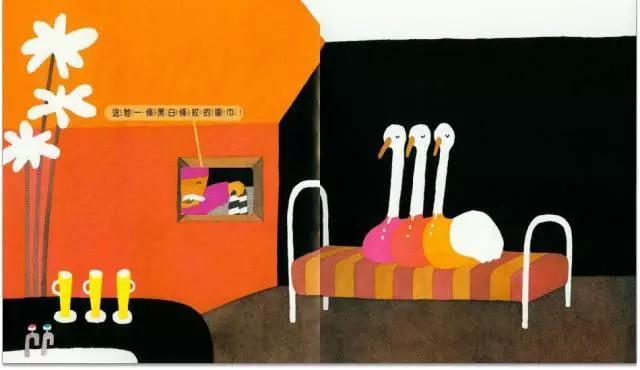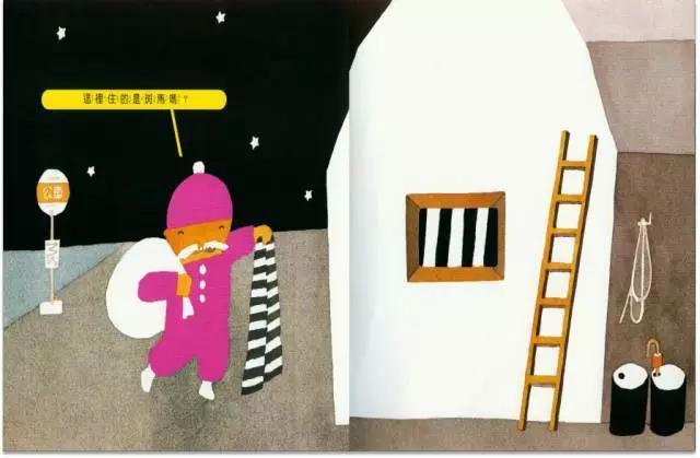 那就送给他一条条纹围巾。啊,原来不是斑马,是三只并排的鸵鸟,我们从窗户看到的是鸵鸟的脖子和黑色的背景墙交相辉映呈现出的一种假象。正因为看到的实物和从窗户里看到的局部图案反差是如此之大,更让孩子们笑得前仰后合。