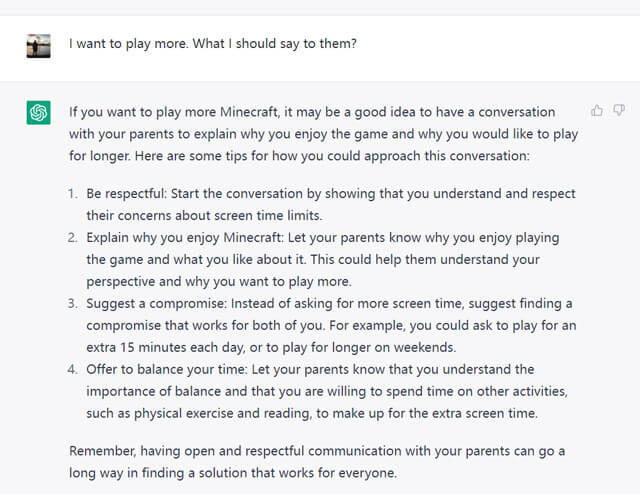 上学了,晚上回家,是不是又要和孩子在游戏时间上斗智斗勇了?再来选择一下,如果孩子问你:我能不能多玩一会儿游戏?你会选择如何回答?C. 你怎么天天都这样?作业不做完,尽想着打游戏?这次,孩子求助ChatGPT了,想让它帮自己争取多玩一会儿,猜猜它如何回答?第一,要尊重爸爸妈妈,表明你理解和尊重爸爸妈妈对你屏幕时间的要求。第二,解释你为什么喜欢我的世界。让父母了解你喜欢玩这款游戏的原因,让他们可以站在你的视角去理解你,为什么想多玩一会儿。第三,提出一个双方都可以接受的建议。与其要求多玩一会儿,不如建议每天多玩十五分钟或者周末延长一些屏幕时间。第四,合理安排自己的时间,让父母知道你了解合理安排时间的重要性,向他们展示出你愿意花时间在其它活动上,比如户外运动和阅读,以此来补偿增加的屏幕时间。请记住,与你的父母保持开放且彼此尊重的沟通,可以让你找出一个每个人都能接受的解决办法。怎么样?如果孩子听了ChatGPT的话,这么来跟你谈判,是不是该舒舒服服地“妥协”一下了?被ChatGPT养出来的孩子,那情商是相当高啊。