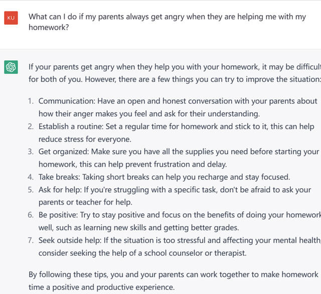 开学了,又要开始每天辅导孩子写作业了,有没有很崩溃?其实孩子也很崩溃,如果孩子问:爸爸妈妈陪我做作业总是生气怎么办?ChatGPT再次展现出自己的理性和情商: