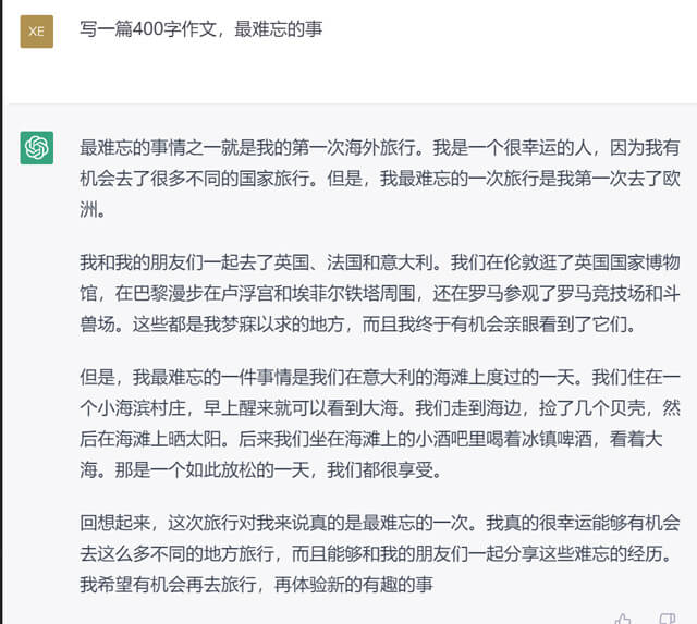 儿子让ChatGPT帮他写一下小学生作文《难忘的一天》,400字,不到十秒出稿:可以看出,中文AI的语言节奏并不好,也不可能是孩子的真实生活的体现,但不妨碍它成为一篇足以应付老师的应试作文。有人说这是糟糕的高级作弊工具。不过,如果写作不能成为一种与自己、与他人沟通的方式,不能成为一种记录真实体验、反思、思考的工具,只是为了满足老师而写、写出满篇复制粘贴好词好句的“好文”,又何尝不是一种糟糕的作弊呢?有媒体报道说,美国有高达83%的大学生都用ChatGPT来写作业,还有学生用它来考试作弊、抄袭论文。并且ChatGPT抄袭的神奇之处在于,你把怀疑抄袭的论文拿到所属学术资源库去比对,是查不出来抄袭的,因为它生成的文字都是AI“原创”的。大学教授直言——深感恐惧。你说学习是为了找好工作,有竞争力,ChatGPT参加顶流大厂Google L3工程师的入职考试,轻松拿下了年薪18万美金的工作:还通过了医学考试,你苦读十年书,可能分分钟被ChatGPT替代了。