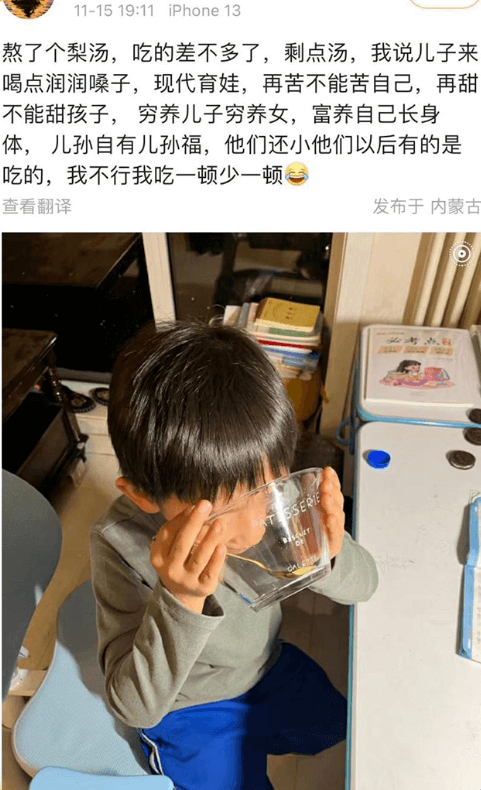 一位妈妈炖了一碗梨汤,梨肉吃的差不多了,才把房间里认真背书的儿子叫出来,声音温柔,贴心至极:“天气干燥,来喝点汤润润嗓子。”