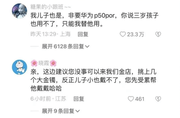 “我儿子也是,非要华为p50por,你说三岁孩子也用不了,只能我替他用。”
