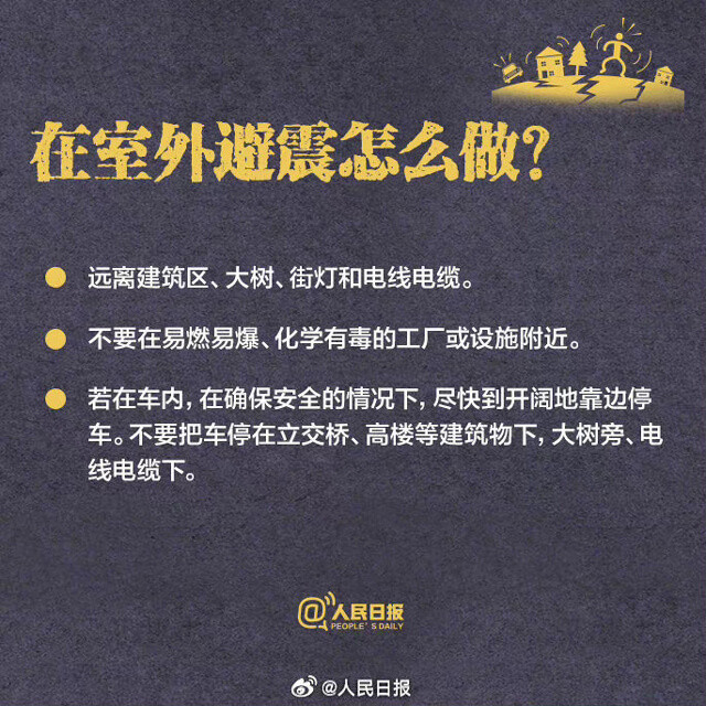 ◆ 地震时正好在室外,要注意远离建筑物、大树、电线杆等可能倒塌的物体,寻找空旷的场地后蹲下,用双手护住头部原地等待。
