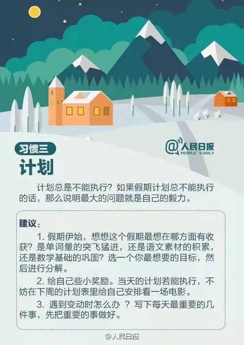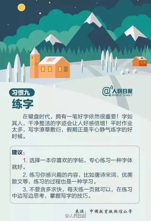 殊不知,假期正是培养、养成好习惯的关键期。趁着假期,也要多读好书、预习新知识、提高学习效率、努力锻炼身体等等。