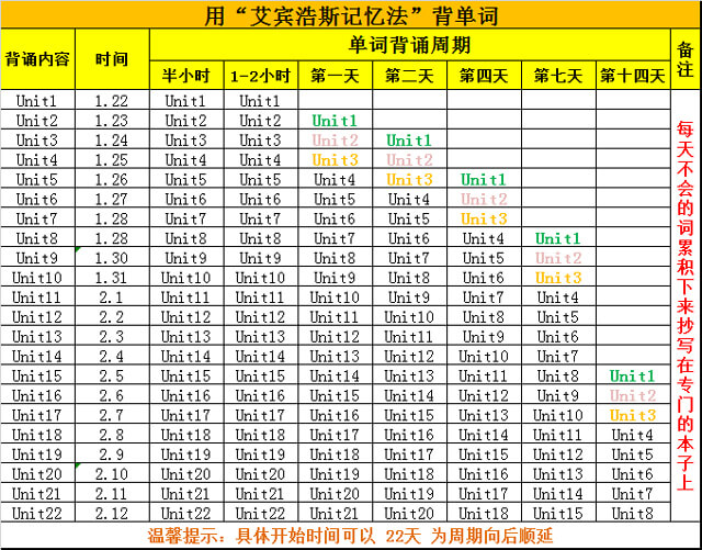 单词容易遗忘的根本原因是用的少,即重复的次数不够,在单词快要遗忘的时候去复习,这样就可以很好地和遗忘做斗争,没有几人真的能过目不忘,只不过就是重复的次数多了,把内容深深的印到脑子里而已。我们九年组老师在放假之前,根据艾宾浩斯遗忘曲线的规律研究了一个帮助同学们记忆单词的表格,以两周为一个周期,22天为一轮,并且要求学生回家按步骤复习,在这里可以供大家参考一下。