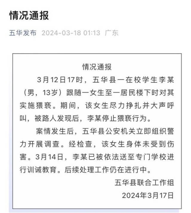很快,当地发布情况通报,称李某已被依法送到专门学校进行训诫教育。