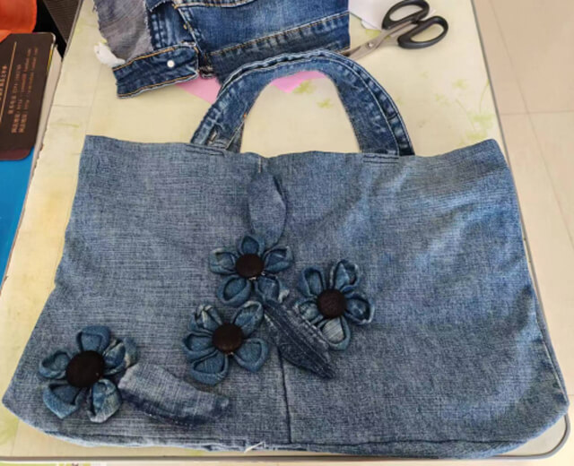 为了响应“减塑限塑”活动,我专门动手做了一个购物袋。家里废弃的牛仔裤是不可多得做购物袋的好材料,颜值高,耐磨性好。所以闲暇时间便找来裁剪了做了一个漂亮的购物袋。还用多余的布料做了极度几朵小花装饰下。购物袋提手是裤腰部分,现成的,裁剪下就好。见下图: