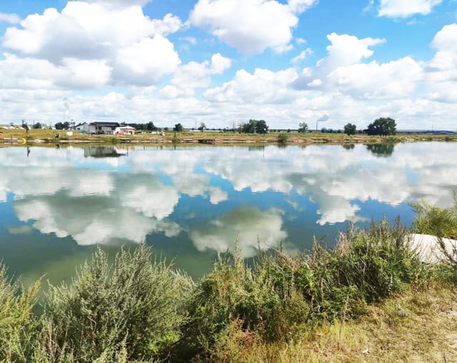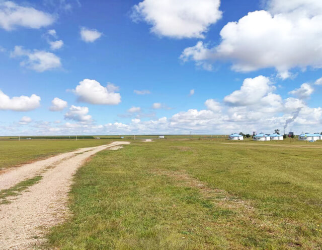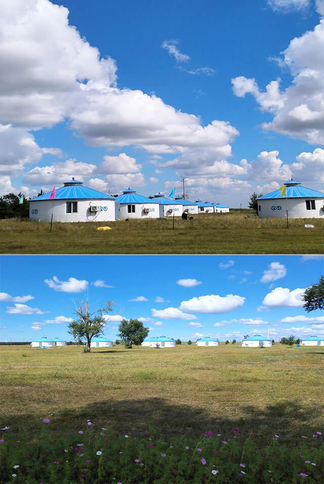 与牛群亲密邂逅之后,我们很快到达了目的地——陶海家庭牧场。牧场规模不大,位于国道旁,十几座蓝白相间的蒙古包错落在碧绿的草地上,南面是一个阔大的湖泊,蜿蜒的海拉尔河穿过牧场,一路向西流去。