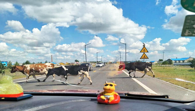 也许是为了让我们平复一下激动的心,在浩特陶海附近,我们被一队缓缓地横穿公路的牛群挡住了。它们气定神闲,踱着方步,对公路上的车辆看都不看,从容淡定地排队去草原上吃早餐。这片草原是属于它们的,它们才是这里的主人。