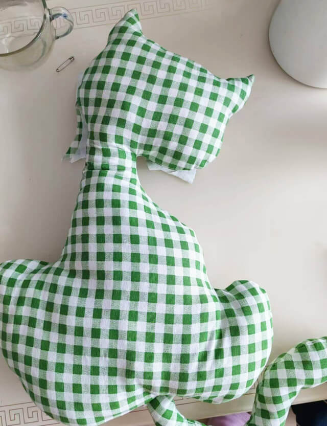 接下来就是用平针缝合了,我用了倒针法,这样可以使成品更结实,而且用线走一遍就行,如果用平针,最好再返回来缝一遍,以保证其结实程度。当然如果有缝纫机会提高效率,可是我更喜欢手缝。记得留好填充口,十厘米宽就可以,还可以更窄些,自己把握好就行。尾巴处建议把填充口留到中间突起部分,身体的填充口可以留在后背上,因为这些地方便于填充和缝合。