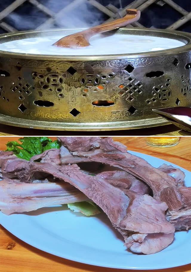 骑马、射箭、荡秋千,玩了一上午,该吃饭了。蒙古包里,我们围桌而坐,现代与传统的结合。主人端上了现场熬制的锅茶,芥子米、奶油、肉干、奶皮子统统熔融在一大铜锅中,翻滚的淡褐色的奶茶强烈地散发着浓郁的香气。手把肉火候正好,一刀切下去,微微泛出血丝,蘸一口草原自产的韭菜花,就一口浓烈的白酒,飘飘然也!微醺之际,伴着悠扬的长调,纵马在草原上放情飞奔,又该是多么惬意的事,人生之得意莫过于此吧!我是真的羡慕起那些游牧的蒙古先民了。