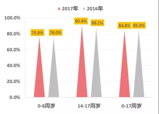 14—17周岁青少年图书阅读率为90.4%,较2016年的88.2%提高了2.2个百分,成功迈过90%这一大关!