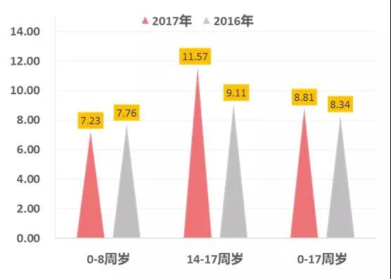 14—17周岁未成年人课外图书的阅读量为11.57本,比2016年的9.11本增加了2.46本;往年的增长幅度一般在5%左右,像今年这样接近30%的大幅增长是史无前例的。