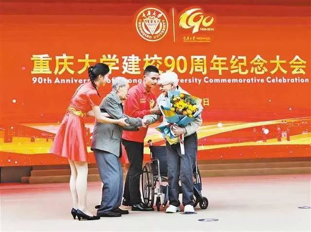 在重庆大学建校90周年纪念大会的现场,1945级学生、现年95岁的丁传培为自己的老师、现年94岁的许香穂献上鲜花的一幕完美诠释了尊师重教的传承之美。