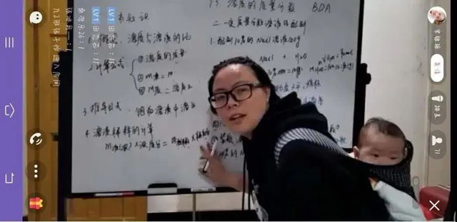 来自安徽省蚌埠市固镇任桥民族中学的“90”后化学老师罗银艳,因孩子太小,丈夫在部队,为了不耽误毕业班的学习进度,她背起娃娃给学生上网课。