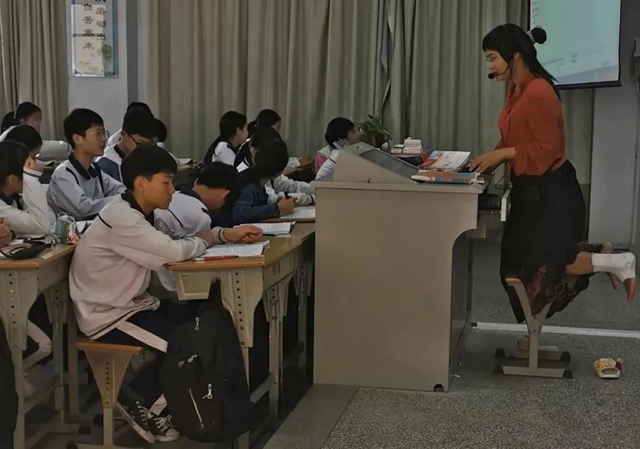 广州潮州瓷都实验中学的语文老师谢小玲不慎摔跤致左脚踝骨折,但为了不耽误学生的课程,她没有顾忌伤痛,即使脚缠绷带也坚持双腿跪在椅子上教学。