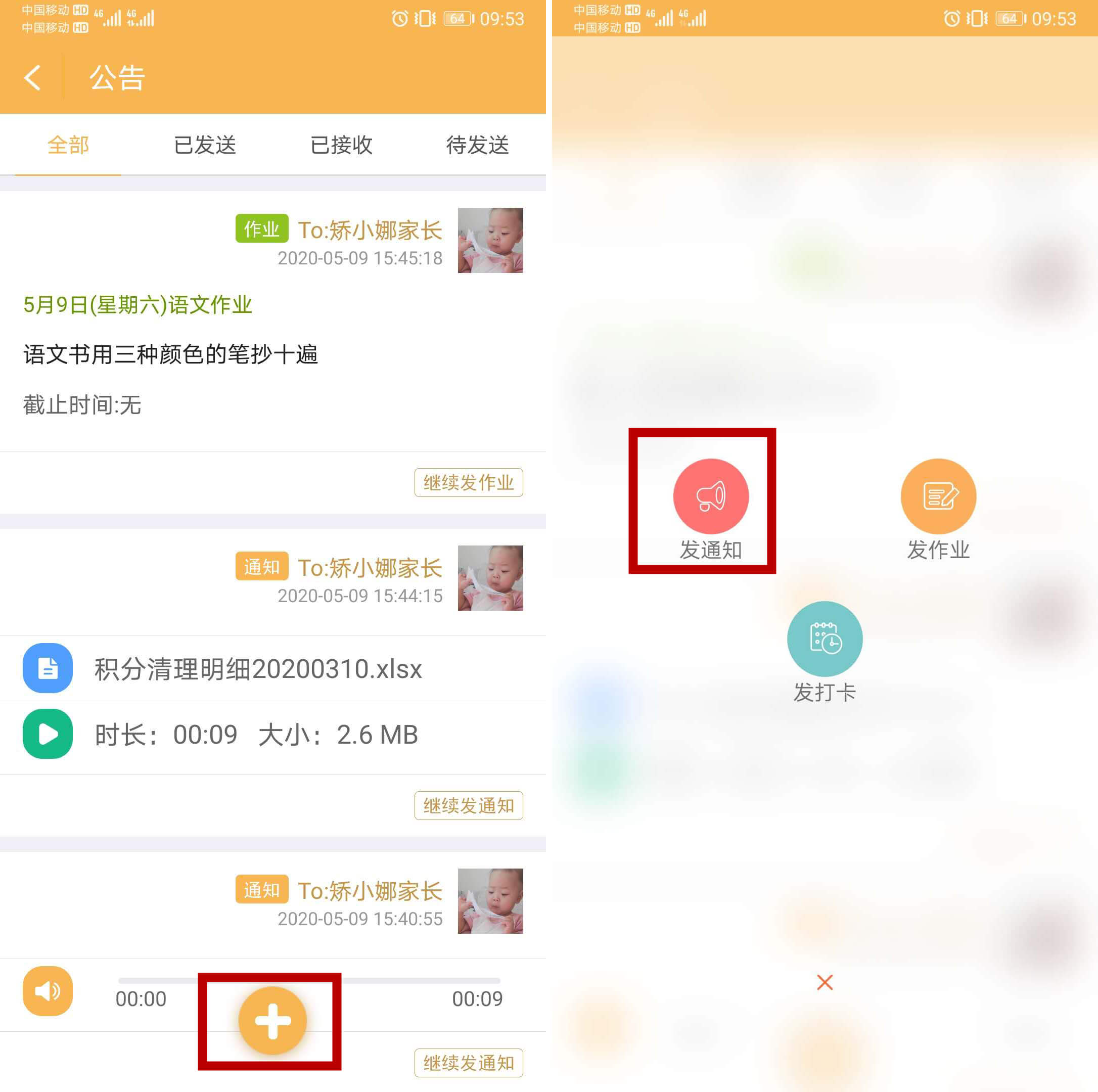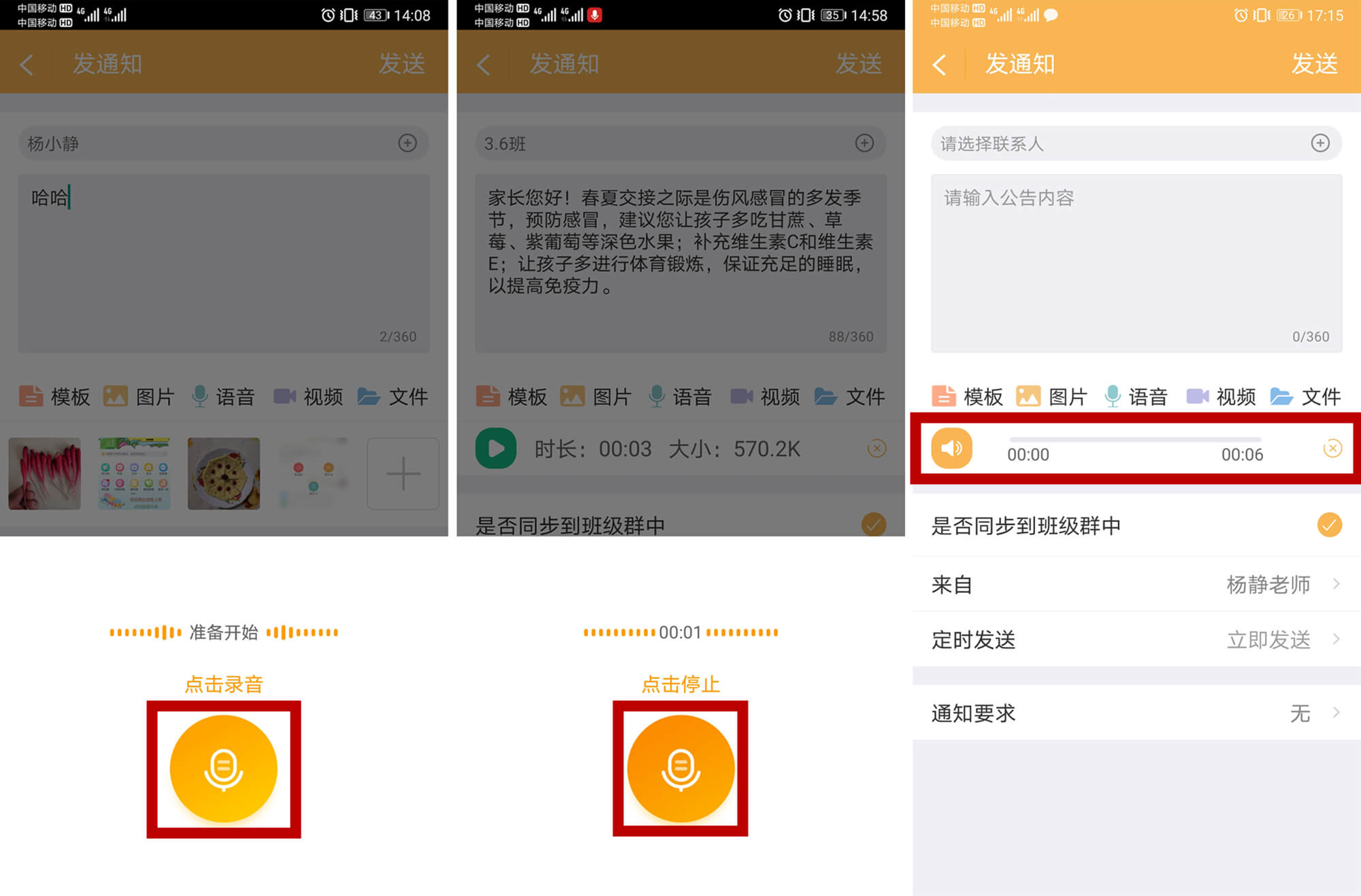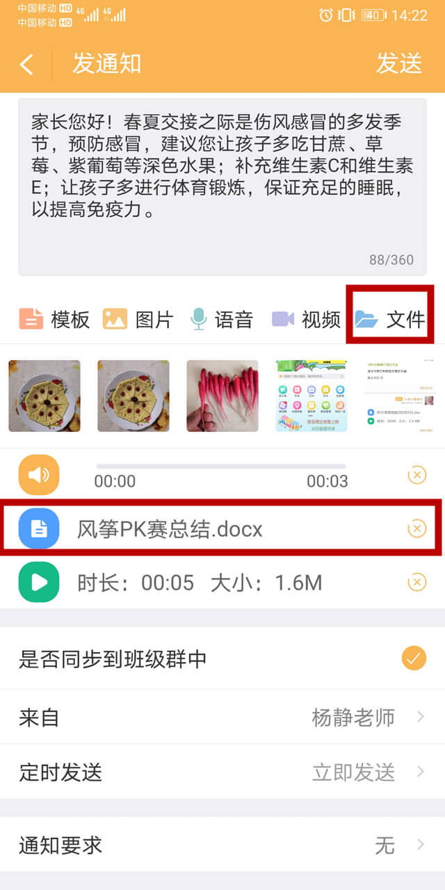 教师发公告种类丰富,既能发文字,也能发图片、语音、视频和文件,也可以多种综合发送。