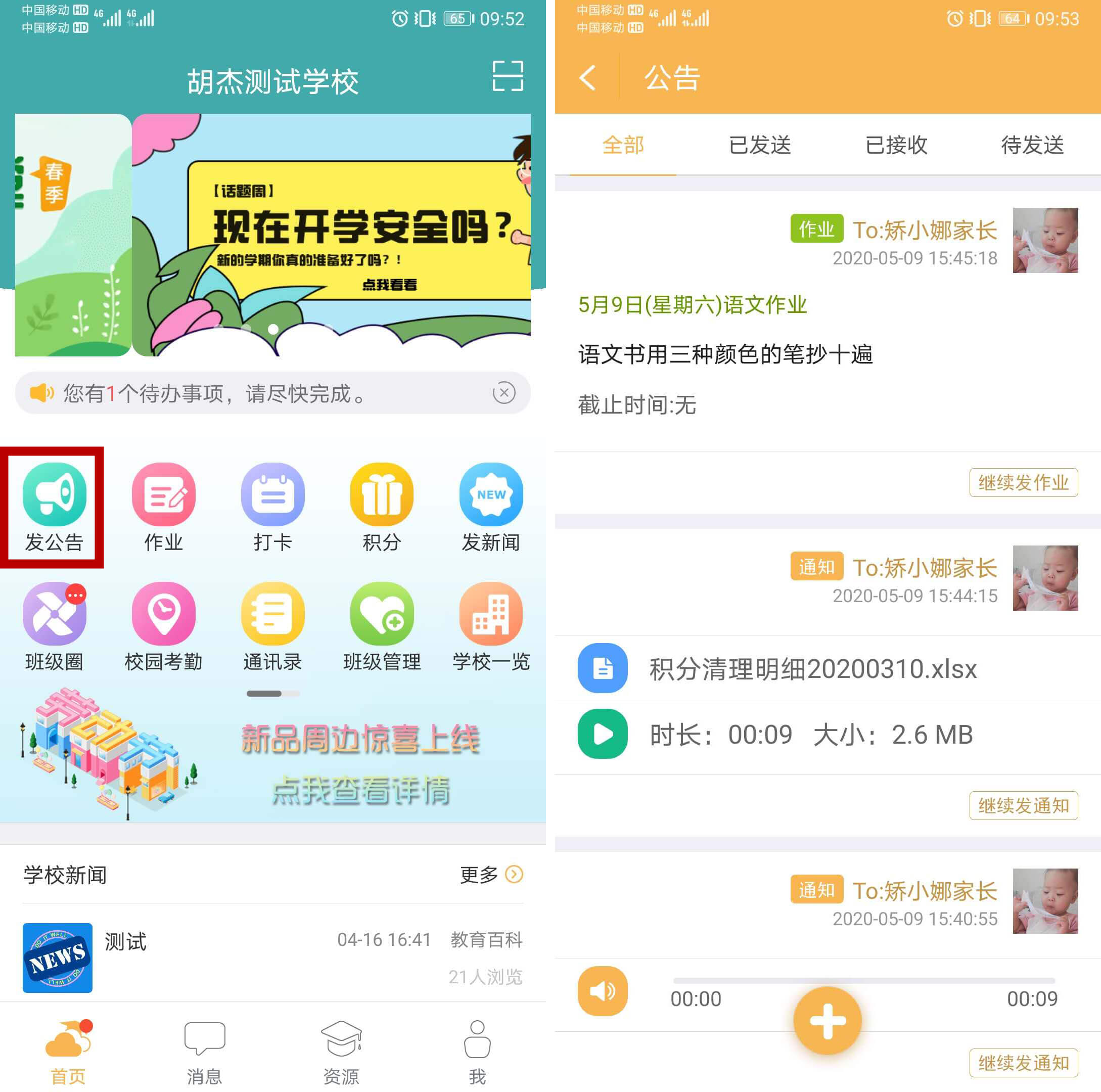 教师发出的公告,下载并安装了“和校园家长版”的家长会接到通知提醒,登录点击首页“校园通知”,就能看到您发的内容啦!