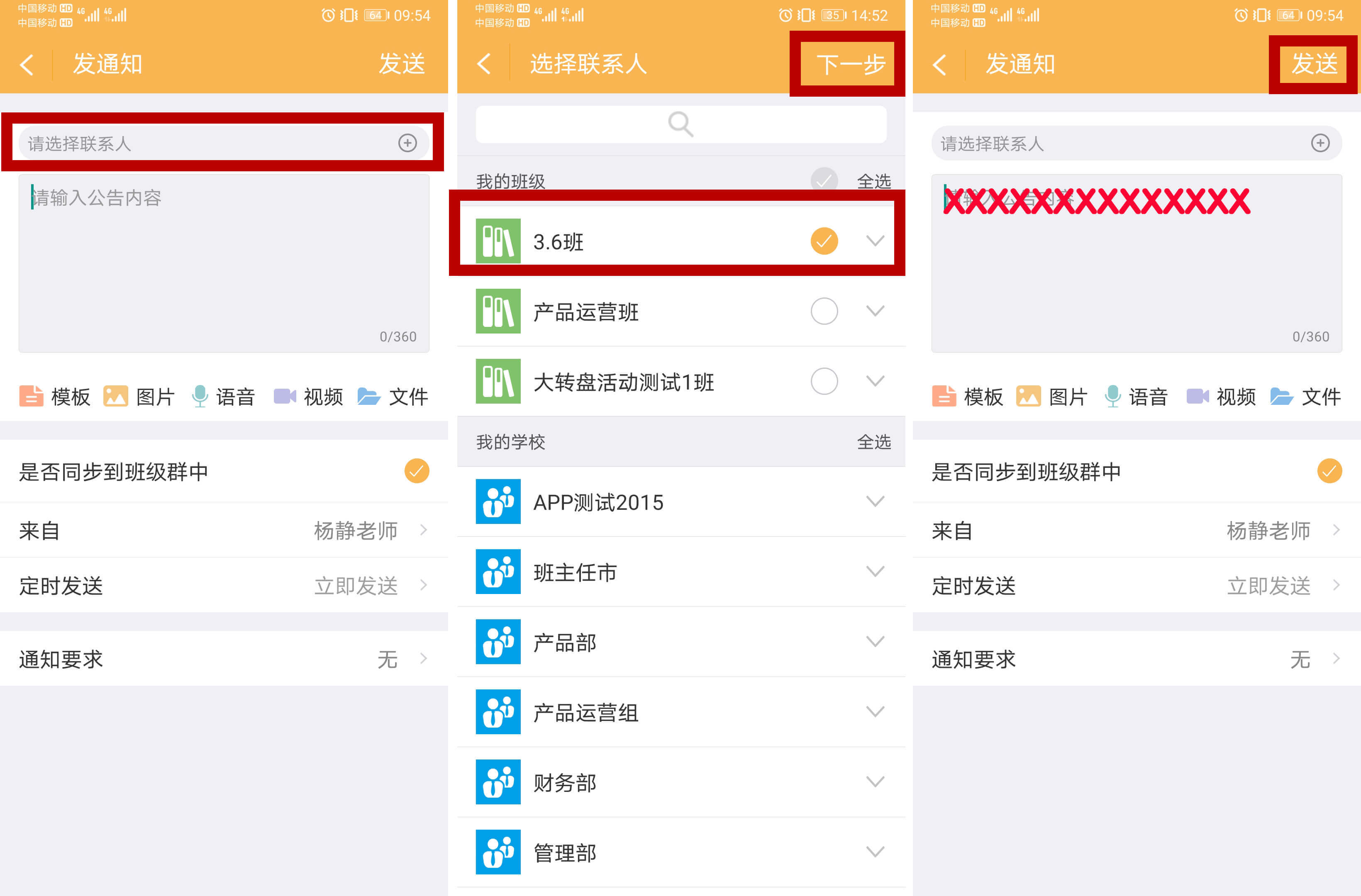 3.先选择联系人(如需选择个别联系人可下拉进行选择),选好后点击“下一步”,就可以输入要发送的内容啦!填好内容点击右上角“发送”即可。