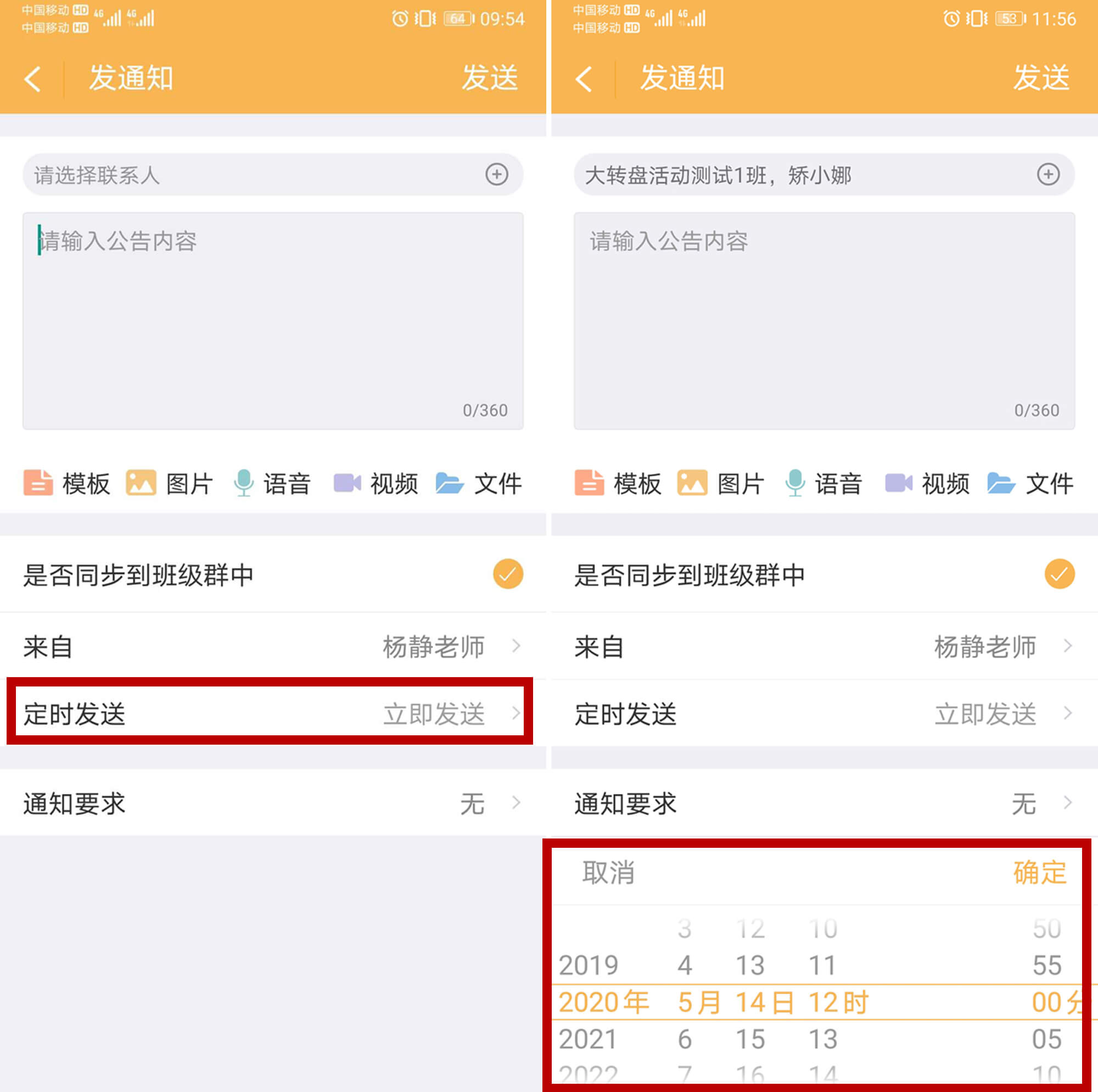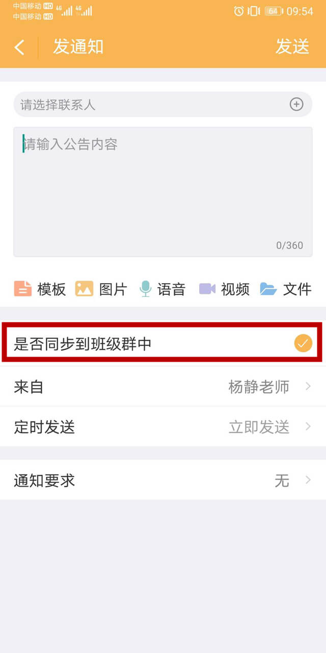 【是否同步到班级群】勾选后,所发公告会同时发到班级聊天群内。