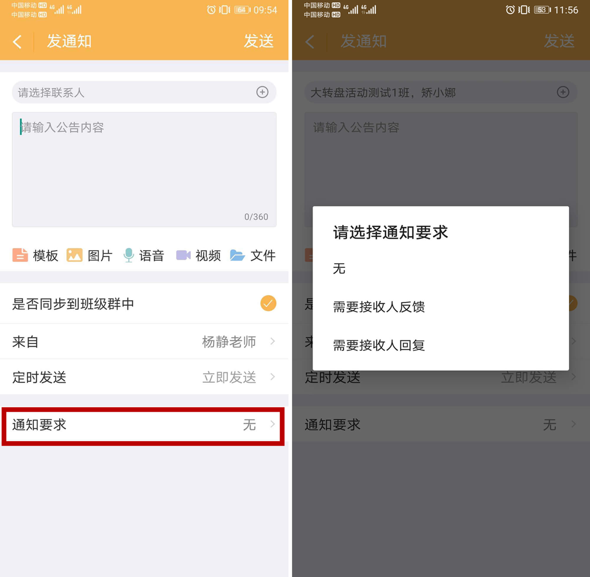 【通知要求】您可以设置要求家长在手机“和校园家长版”上确认或者回复。