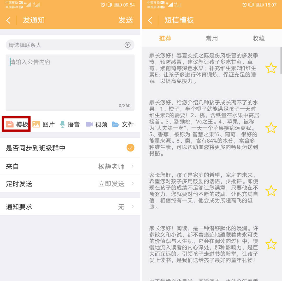 发公告是教师向本班学生及家长发送通知的常用功能,公告一经发出,接收人就能在手机短信和“和校园家长版”内收到通知提醒,方便家校沟通。