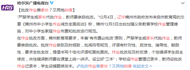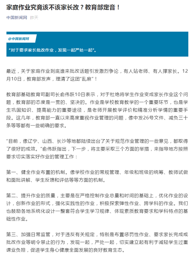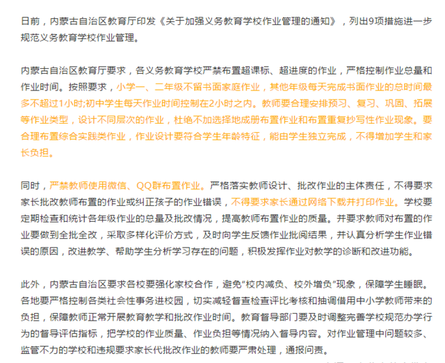 近日,内蒙古自治区教育部也发文禁止家长代为批改作业,严禁教师使用微信、QQ群布置作业。严格控制作业总量和作业时间、监管不力的学校和违规要求家长代批改作业的教师要严肃处理,通报问责。