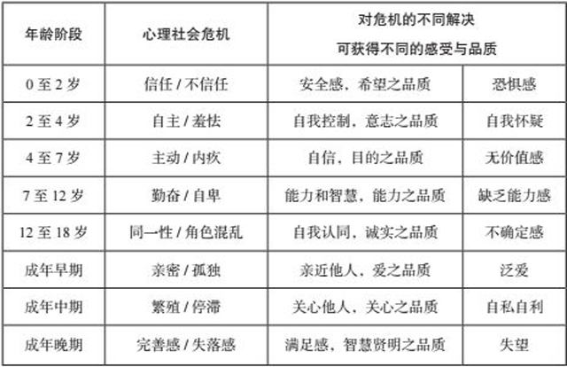 儿童在成长的每个阶段都会遇到成长的危机,危机是划分每个发展阶段的特征。一旦某一阶段的危机得到积极的解决,那这个人的人格中就形成一种美德,美德是某些能够为一个人的自我增添力量的东西,形成一个人重要的道德品质。
