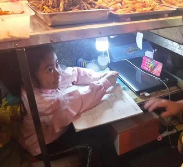 这个小女孩叫柯恩雅,今年刚上一年级。在案板下读书,她的头经常会撞到案板。