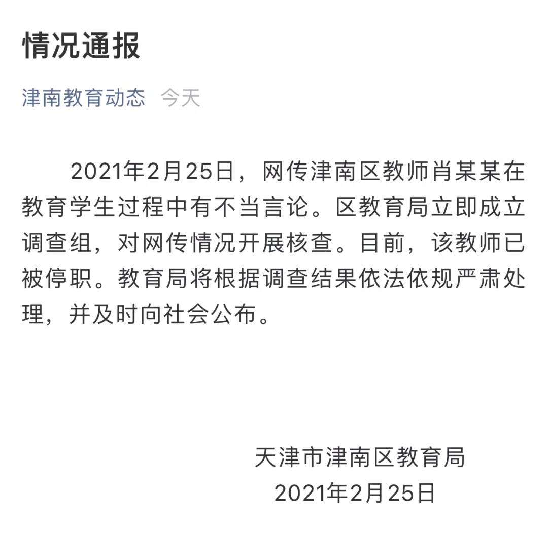 2月25日,有网友爆料称,天津市津南区一中学教师肖某某在教育学生过程中,发表不当言论,将收入与素质划等号。