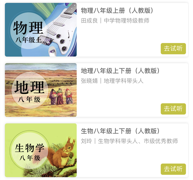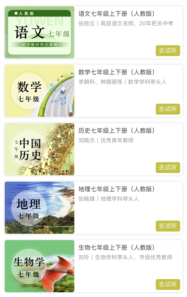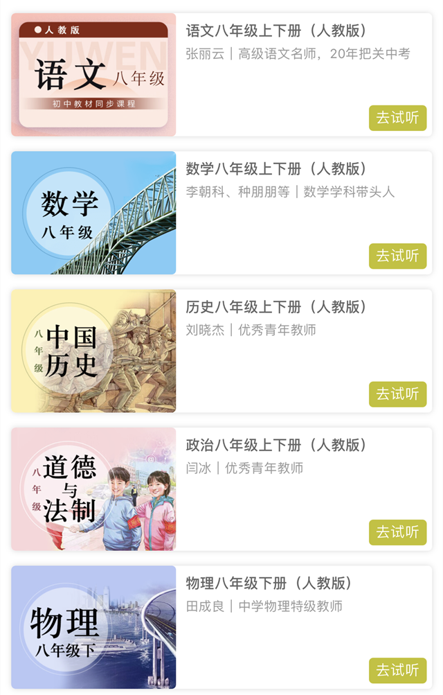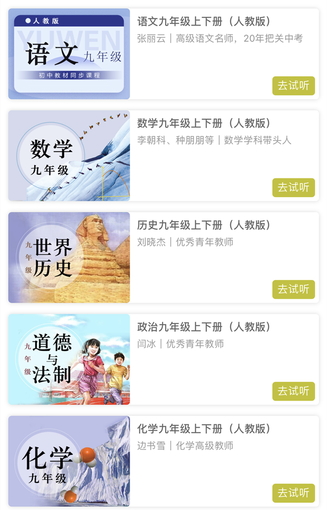 为了让学生更科学、全面深入的学习,小编特为大家推荐初中课本配套的人教版教辅课程,讲师提炼了课程的基础点、重难点、关键点,从基础到提升,将课本中的每个章节、每个知识点,一一为大家讲述,同学们可以随时随地的收听,无论是作为预习还是复习,都是一个更好的学习途径。