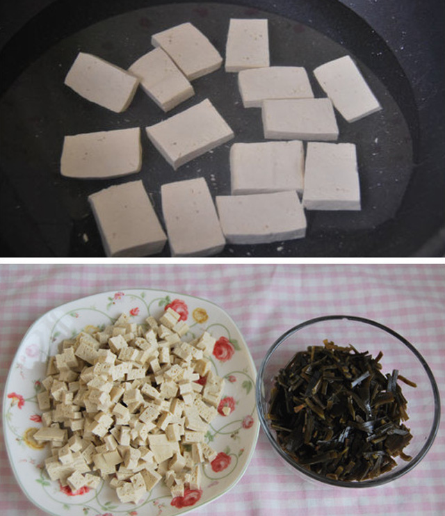 2. 豆腐切成大块,放入锅中加水煮沸,捞出晾凉后,再切成1厘米见方的小丁。