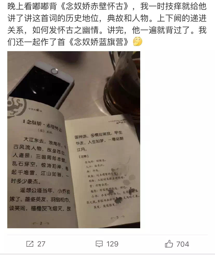 从他的动态中看到,他会从历史入手带孩子解读诗词。这么长的《念奴娇赤壁怀古》,一遍就能背过!