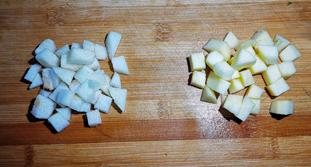 4.苹果、早酥梨去皮洗净,切丁,用淡盐水浸泡,可防止表面氧化变色。