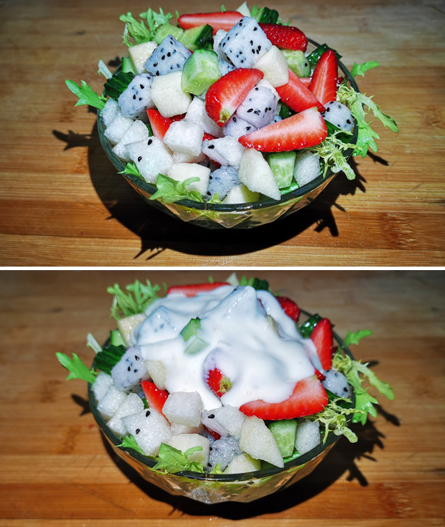 如果是给孩子做水果沙拉,可以选择原味的酸奶,不仅充当了沙拉的调和剂,孩子还可以从中获取到酸奶的营养,奶制品中的钙含量可是很高的哟!