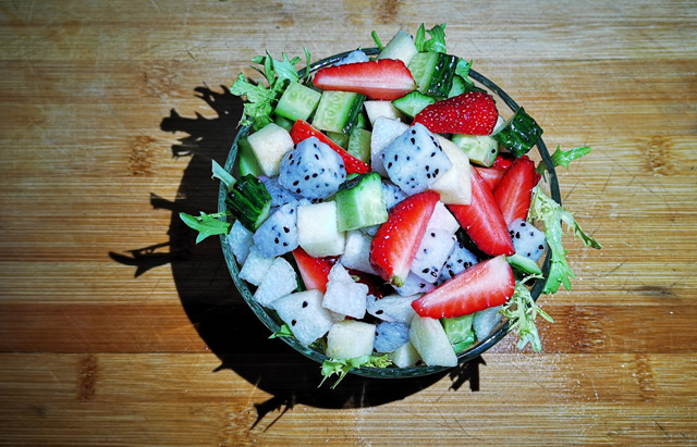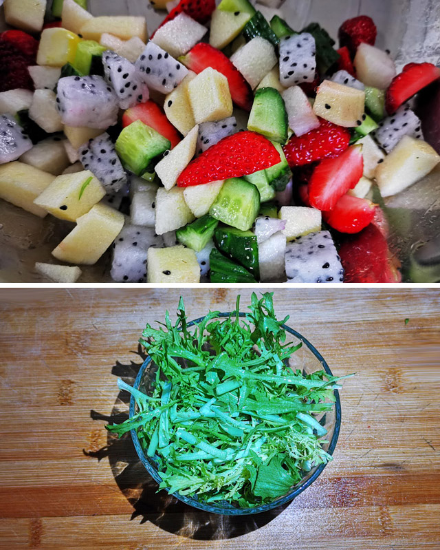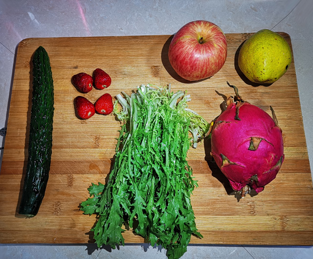 草莓4个,苹果1个,早酥梨1个,火龙果1个,黄瓜1根,苦菊适量,酸奶适量。