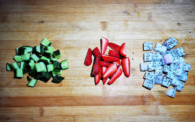 5.草莓去掉蒂部,切成两半备用,黄瓜、火龙果分别去皮,切丁。