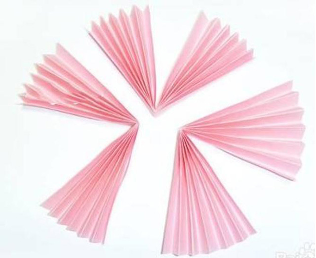 将三张彩纸依次摆放,平行连续折叠,取中间点用绳子系一个蝴蝶结,这是最难的一步,小朋友完成后可以给她一个大大的kiss奖励一下