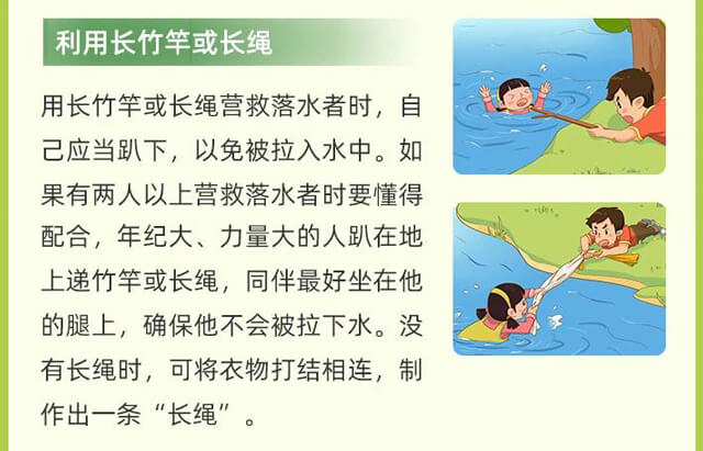 4、当救助者出现时,落水者只要理智还存在,绝不可惊惶失措去抓抱救助者的手、腿、腰等部位,一定要听从救助者的指挥,让他带着你游上岸。否则不仅自己不能获救,反而连累救助者的性命。