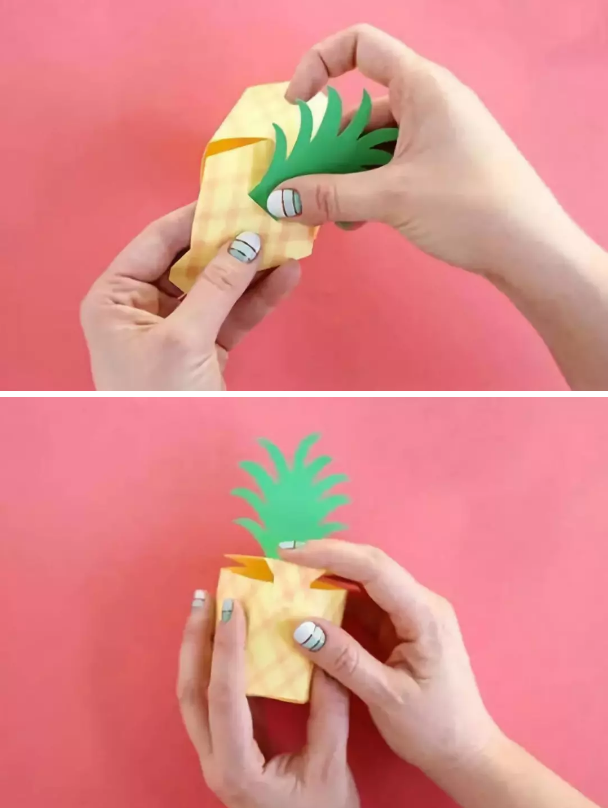在盒子顶部中间割一条缝隙,在把叶子装进去一部分,用粘合剂固定。