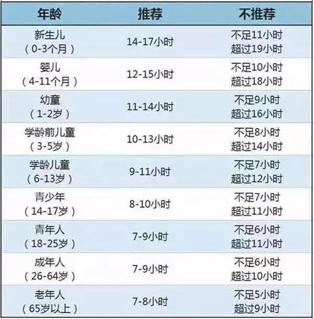 对于新生儿来说,往往需要14至17个小时的睡眠;婴儿需要12至15个小时;学龄前儿童(3~5岁)需要10至13个小时;学龄儿童(6~13岁)需要9至11个小时的睡眠;而青少年则需要8至10小时的睡眠时间。
