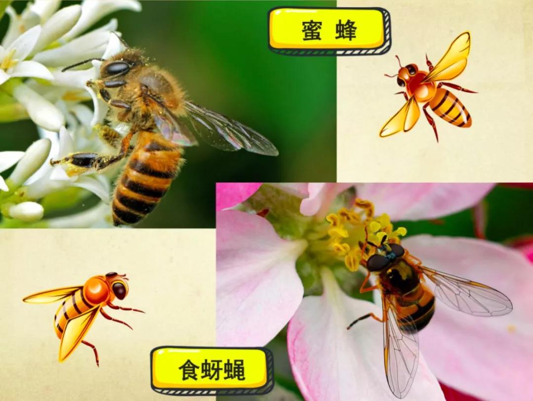 其实也挺简单的,蜜蜂有两对翅膀、食蚜蝇只有一对,而且蜜蜂的肚子是胖胖的、食蚜蝇很瘦的。蜜蜂的触角很明显,食蚜蝇的不明显。