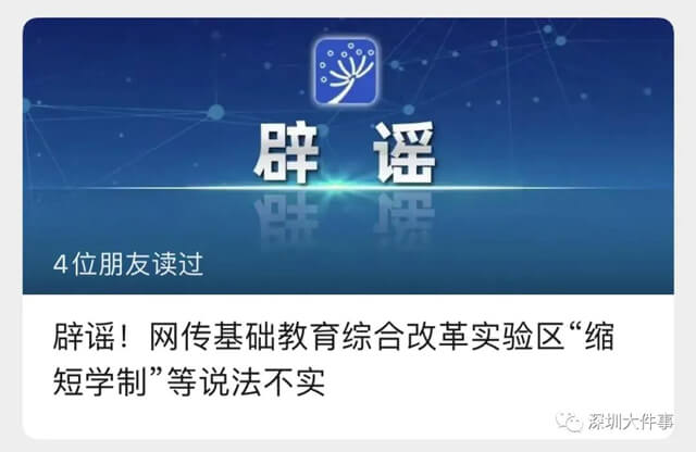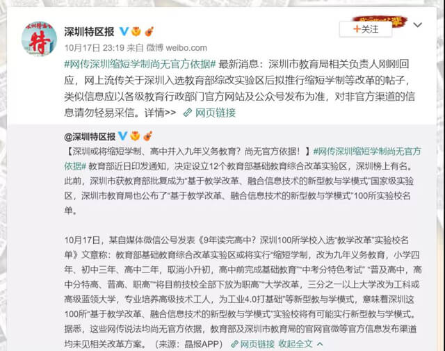 深圳市教育局相关负责人回应,网上流传关于深圳入选教育部综改实验区后拟推行缩短学制等改革的帖子,类似信息应以各级教育行政部门官方网站及公众号发布为准,对非官方渠道的信息请勿轻易采信。(深圳特区报微博)