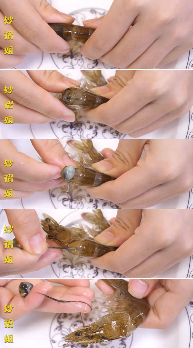 一手捏住虾头,一手捏住虾身,掰开虾头部上方位置,再稍微挤一下虾头,这时虾头里面的胃和肝脏就被挤出来了,我们把这些内脏给拎出来,这样虾身里面的虾线也会跟着出来了。